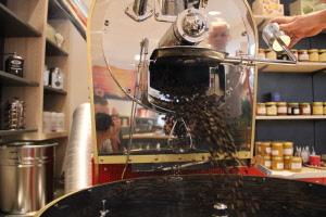 Der Röster muss beim Rösten auf die, der Bohnensorte entsprechende Temperatur, vorgeheizt werden. Wenn auch die Ablufttemperatur, Luftfeuchtigkeit usw. stimmen lassen wir den Rohkaffee von oben in die Rösttrommel ins Innere der Maschine ein. Dadurch fällt die Heiztemperatur um ca. 95° C. Der eigentliche Röstvorgang beginnt. Durch zwei Gasbrenner steigt die Temperatur langsam aber kontinuierlich. Die alte Faustregel war: 14 - 24 Minuten pro Röstvorgang.